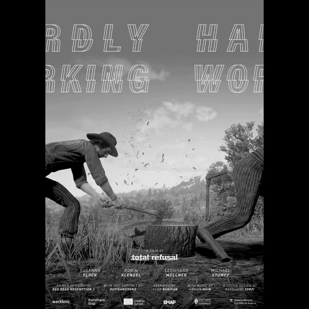 Total Refusal (AT)The pseudo-marxist media guerilla Total Refusal is a collective of artists, researchers, and filmmakers who upcycle the resources of mainstream video games to create political narratives in the form of videos, interventions, performances, and lectures. The collective’s themes are informed by critical game studies and social theory in an attempt to promote and popularize a counter-hegemonic left. Their work has been screened at over 400 film and art festivals and exhibited at various spaces. Since their foundation in 2018, Total Refusal have been awarded with more than 70 prizes and honorary mentions.